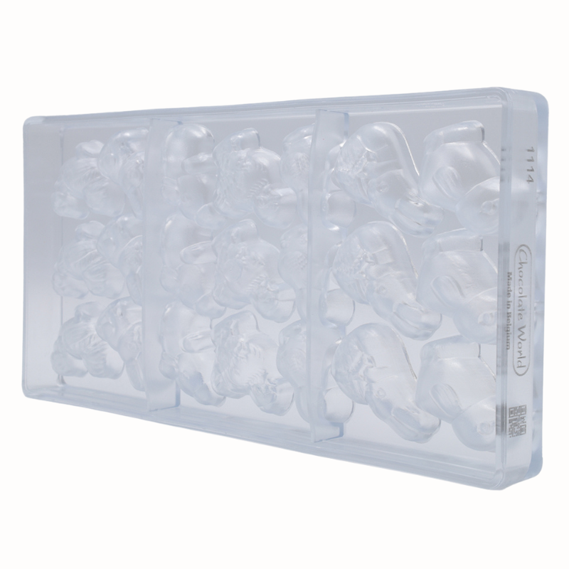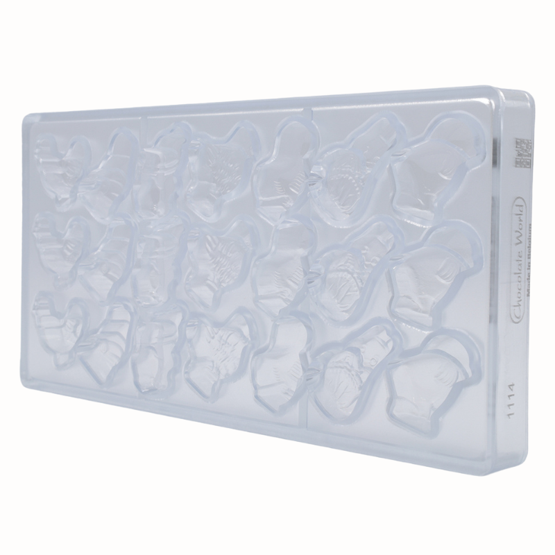 Formy do pracy z czekoladą wykonane z poliwęglanu charakteryzują się wyjątkową trwałością i wytrzymałością. Są odporne na uszkodzenia mechaniczne oraz działanie zarówno wysokich jak i niskich temperatur. Materiał, z którego wykonane są formy zapewnia idealnie błyszczącą powierzchnię wyrobów czekoladowych oraz zmniejsza ryzyko wystąpienia matowych plam. Zapewnia również równomierne rozprowadzanie ciepła, co ma ogromne znaczenie podczas pracy z czekoladą. Dodatkową zaletą form wykonanych z poliwęglanu jest ich transparentna barwa, która pozwala na kontrolę podczas formowania kształtów. Ponadto materiał pod wpływem zmian temperatury kurczy się wolniej niż czekolada, co znacznie ułatwia proces wyjmowania kształtów z formy. Przed wlaniem czekolady, formę należy lekko podgrzać, co zapobiega zbyt dużej różnicy temperatur i tym samym zmętnieniu czekolady. Formy należy napełniać jedynie odpowiednio zatemperowaną czekoladą.
