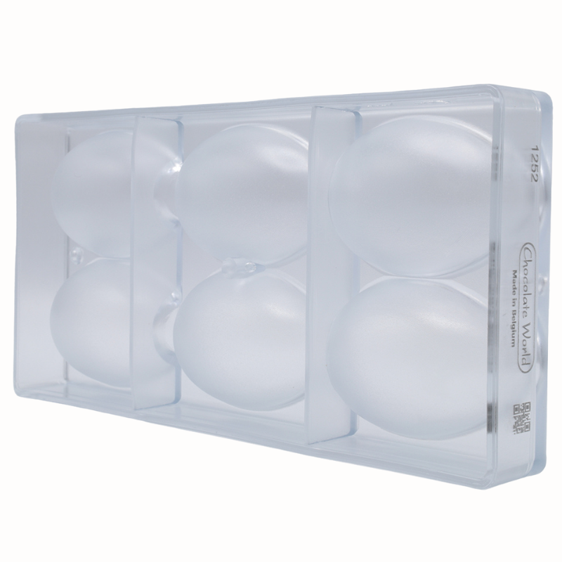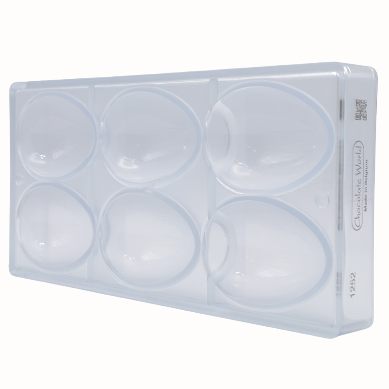 Formy do pracy z czekoladą wykonane z poliwęglanu charakteryzują się wyjątkową trwałością i wytrzymałością. Są odporne na uszkodzenia mechaniczne oraz działanie zarówno wysokich jak i niskich temperatur. Materiał, z którego wykonane są formy zapewnia idealnie błyszczącą powierzchnię wyrobów czekoladowych oraz zmniejsza ryzyko wystąpienia matowych plam. Zapewnia również równomierne rozprowadzanie ciepła, co ma ogromne znaczenie podczas pracy z czekoladą. Dodatkową zaletą form wykonanych z poliwęglanu jest ich transparentna barwa, która pozwala na kontrolę podczas formowania kształtów. Ponadto materiał pod wpływem zmian temperatury kurczy się wolniej niż czekolada, co znacznie ułatwia proces wyjmowania kształtów z formy. Przed wlaniem czekolady, formę należy lekko podgrzać, co zapobiega zbyt dużej różnicy temperatur i tym samym zmętnieniu czekolady. Formy należy napełniać jedynie odpowiednio zatemperowaną czekoladą.