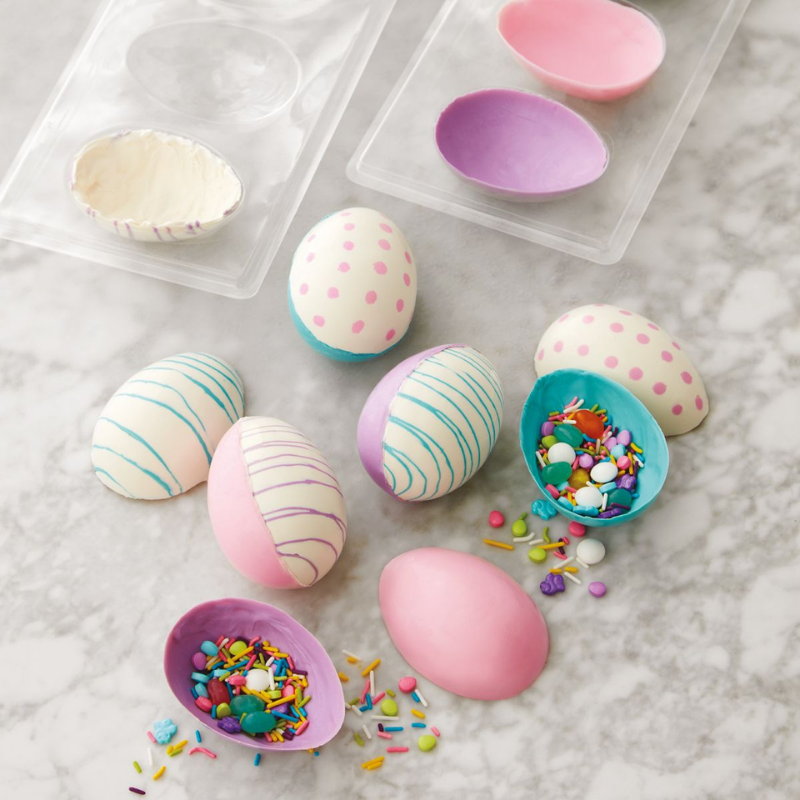 Do wypełnienia bomb czekoladowych w kształcie pisanek idealnie sprawdzi się biała czekolada, którą łatwo zabarwisz przy użyciu kolorowego tłuszczu kakaowego!
