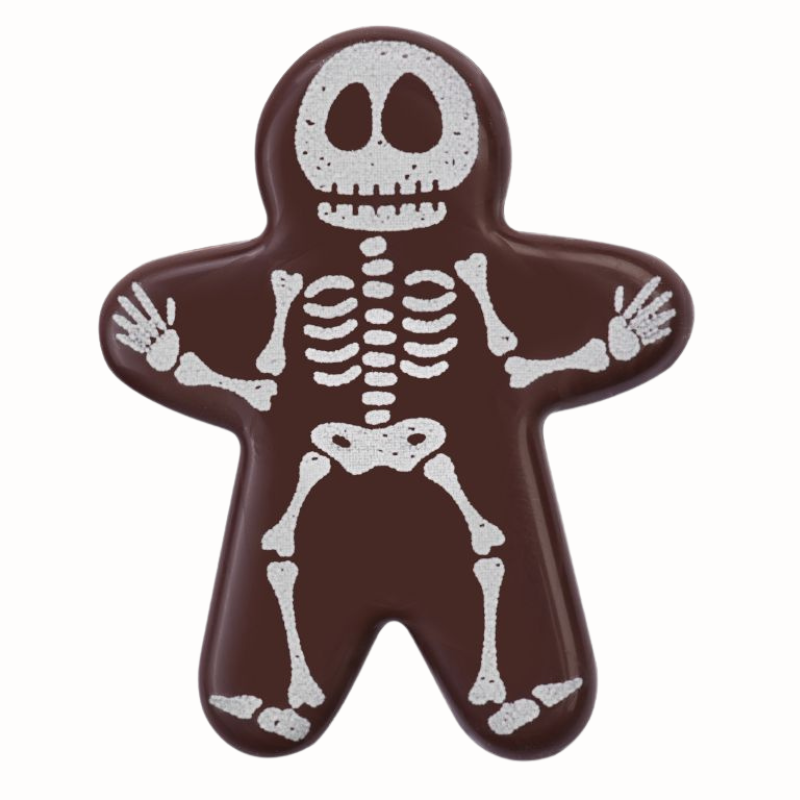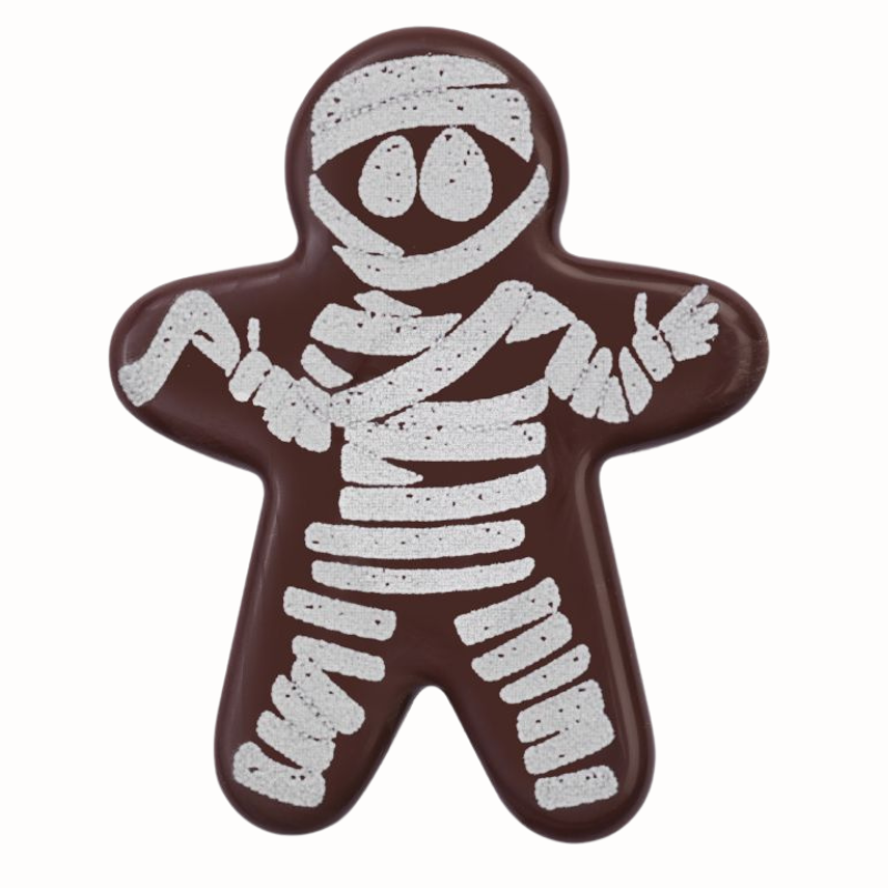 Czekoladowy zestaw ludzików na Halloween. Gotowe dekoracje z ciemnej czekolady w pięciu wzorach - duch, mumia, szkielet. Idealne do ozdobienia wyjątkowo strasznych słodyczy!