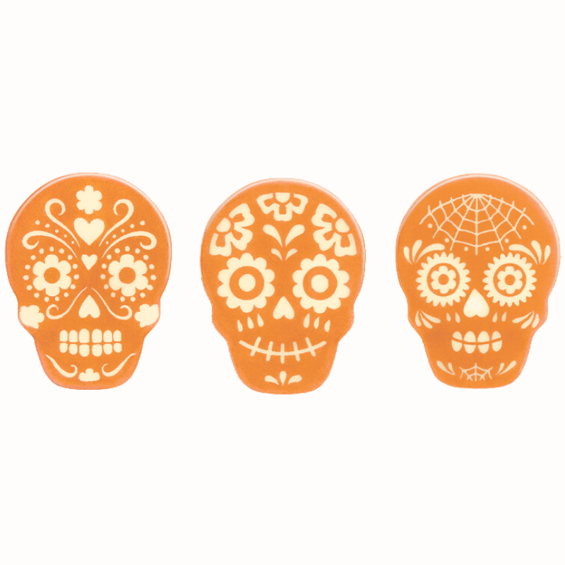 Czekoladowe meksykańskie czaszki, zestaw na Halloween. Gotowe dekoracje z białej czekolady w trzech wzorach. Idealne do ozdobienia wyjątkowo strasznych słodyczy!