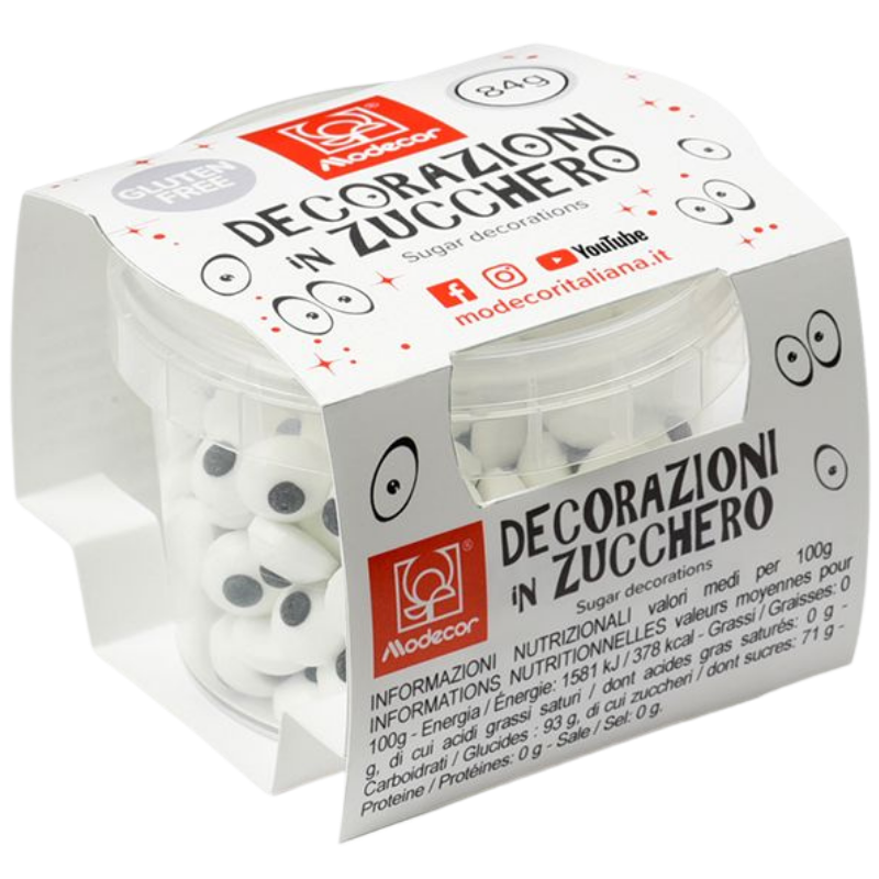 Gotowa dekoracja cukrowa w postaci posypki o średnicy około 10 milimetrów. Cukrowe oczka doskonale nadają się do wykańczania figurek cukrowych oraz tworzenia zabawnych dekoracji na babeczkach, ciasteczkach, deserach, wypiekach i lodach. Wypukłą posypka w kształcie oczu idealnie sprawdzi się do tworzenia strasznych deserów na halloween. Niezbędny element podczas dekorowania tortów i muffinek na przyjęcia urodzinowe dla dzieci.