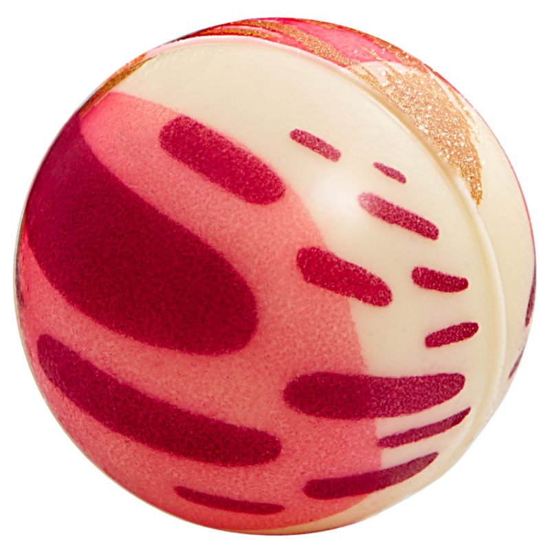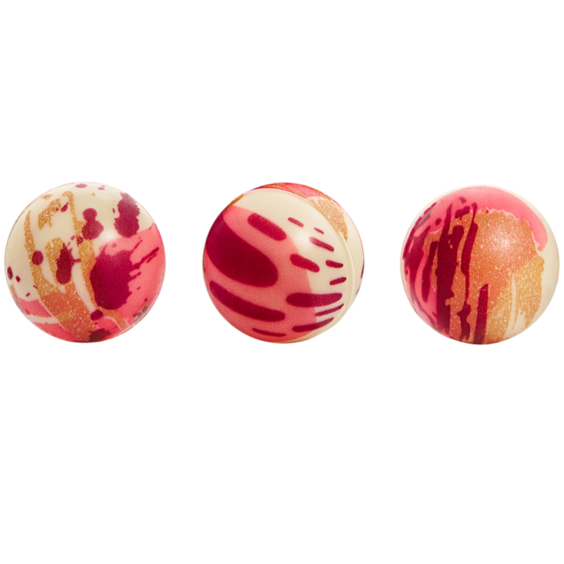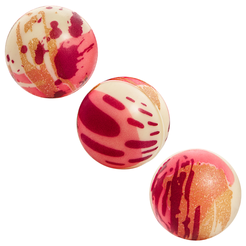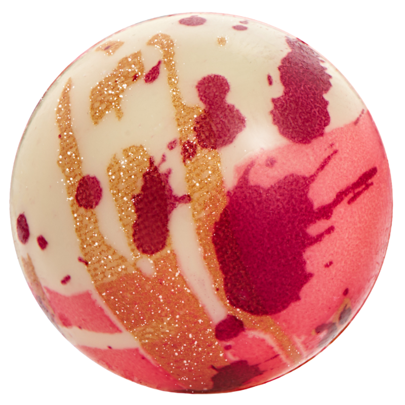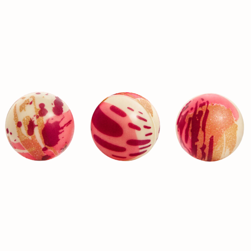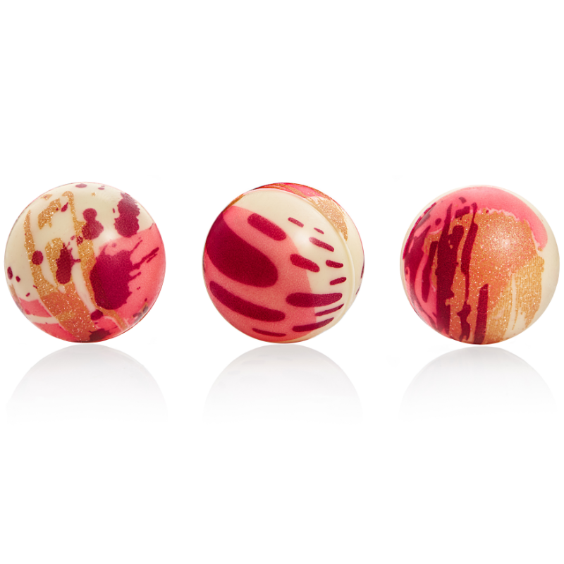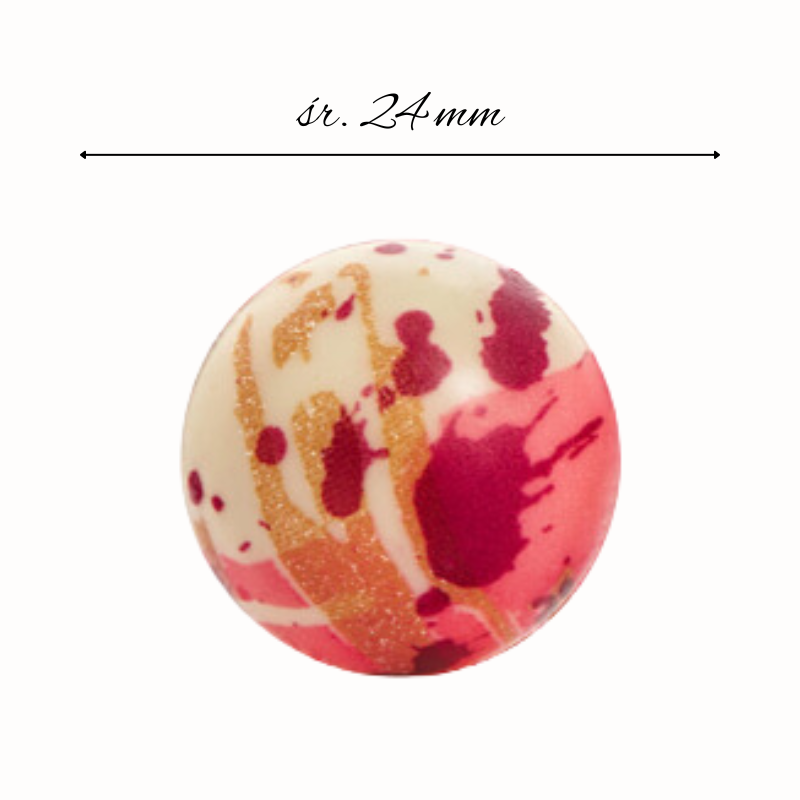Kulki Florence, to zestaw trójwymiarowych kulek z białej czekolady o średnicy 24 milimetrów. Jadalny nadruk w odcieniach fioletu i różu ze złotymi akcentami. Abstrakcyjny wzór inspirowany klimatem włoskiej Florencji.