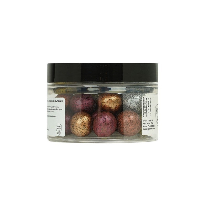 Kulki czekoladowe z metalizowaną powłoką o średnicy około 15 mm do dekoracji cukierniczych.