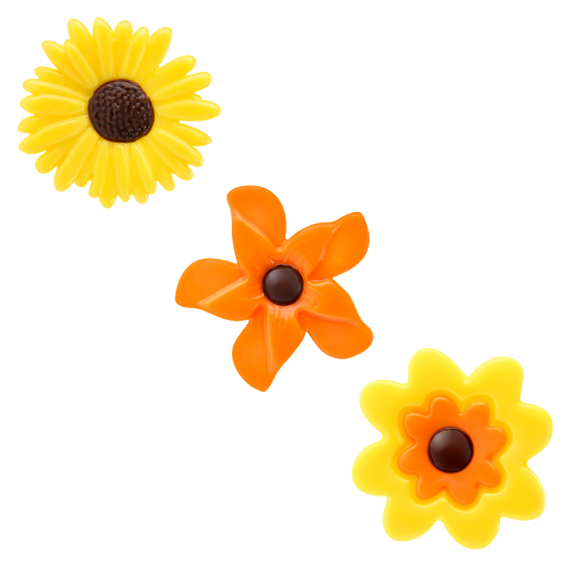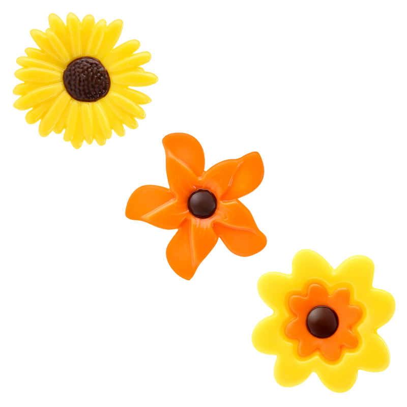 Kolorowa dekoracja w kształcie kwiatów wykonana z wysokiej jakości barwionej białej czekolady. Idealny sposób na szybką i efektowną dekorację Twoich słodkich wyrobów. Doskonale sprawdzą się zarówno w profesjonalnej jak i domowej pracowni cukierniczej.