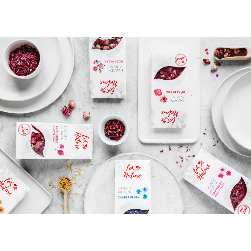 KWIATY JADALNE - to seria konfekcjonowanych przez polskiego producenta suszy roślinnych w jakości premium. Suszone kwiaty i owoce charakteryzują się naturalnym i przyjemnym smakiem oraz aromatem. Zależnie od rodzaju susze doskonale sprawdzą się jako dodatek do naparów i napojów oraz potraw czy sałatek. Suszone kwiaty to idealny sposób na szybkie, naturalne i efektowne udekorowanie zarówno wytrawnych jak i słodkich wyrobów. Najczęściej stosowane są do dekoracji tortów oraz wyrobów z kremami. Są to "produkty stworzone z miłości do kwiatów, smaków i kolorów".