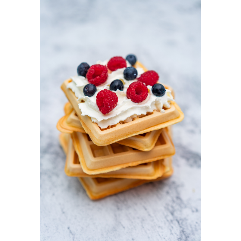 Mieszanka bazowa do przygotowywania gofrów biszkoptowych przeznaczona przede wszystkim do stosowania w punktach gastronomicznych oraz cukiernictwie. Baza do gofrów to mieszanka suchych składników w proszku (w tym jaj) w odpowiednio dobranych proporcjach. Bardzo łatwa w użyciu - do mieszanki wystarczy dodać wodę (w temperaturze pokojowej) oraz tłuszcz (olej roślinny) i dokładnie wymieszać (do uzyskania jednolitej konsystencji ciasta). Stosowanie bazy zapewnia powtarzalność podawanych gofrów oraz znacząco skraca czas przygotowania ciasta, co wpływa na usprawnienie i przyspieszenie pracy oraz zapewnienie stałej jakości podawanych wypieków. Ciasto przeznaczone jest do wypiekania w profesjonalnych gofrownicach gastronomicznych lub mniejszych gofrownicach do użytku domowego.