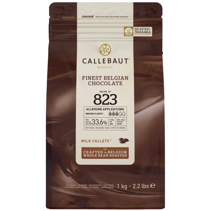 Uniwersalna mleczna czekolada wytwarzana z mieszanki wyselekcjonowanych ziaren kakaowych z trzech różnych krajów - Wybrzeże Kości Słoniowej, Ghana, Ekwador - dla uzyskania idealnie harmonijnego, bogatego smaku. Czekolada zawdzięcza swój unikalny profil smakowy wysokiej zawartości kakao pozyskiwanego z najlepszych ziaren. Charakteryzuje się zrównoważonym i bogatym smakiem z dominującymi nutami mleka i karmelu. Idealna płynność czekolady sprawia, że doskonale sprawdzi się w różnorodnych zastosowaniach. Receptura numer 823 - to mleczna belgijska czekolada o minimalnej zawartości kakao 33.6% i statusie kuwertury (zawartość masła kakaowego - 36.2%).