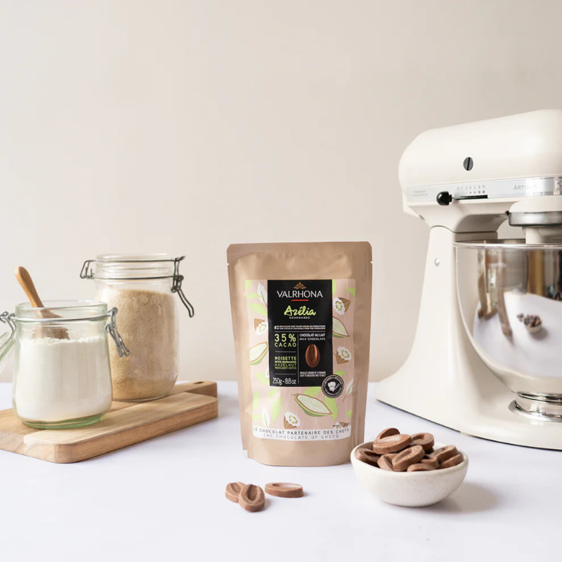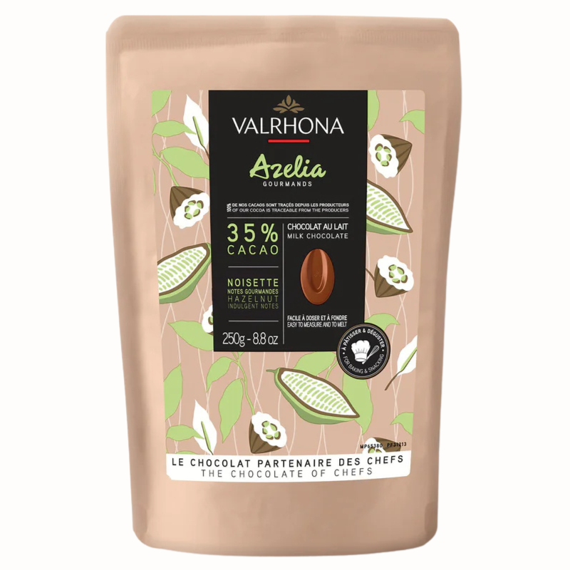 Azélia, to delikatna mleczna czekolada z orzechami laskowymi. Doskonałe połączenie słodyczy z aromatem prażonych orzechów laskowych. Czekolada z dodatkiem orzechów laskowych o średniej płynności i uniwersalnym zastosowaniu. Idealnie sprawdzi się jako baza do aromatycznych polew i glazur czekoladowych. Będzie doskonałą podstawą klasycznych kremów, musów, ganache i deserów. Z czekoladą przygotujesz także kremowe i aromatyczne lody i sorbety czekoladowe z orzechowym akcentem. Czekolada z dodatkiem orzechów laskowych pozwala uzyskać wyjątkowy smak pralin, batonów oraz innych wyrobów formowanych. Czekolada charakteryzuje się wyjątkowo gładką i kremową konsystencją. Nuty prażonych orzechów laskowych umiejętnie skomponowane z delikatną, gładką i idealnie słodką mleczną czekoladą!