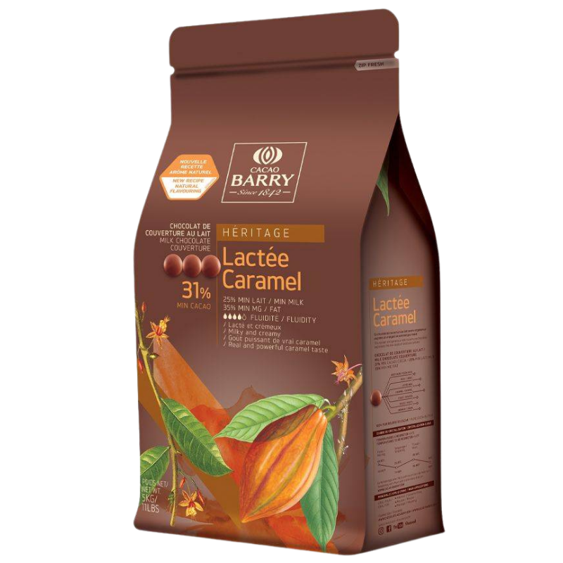 Wyjątkowo kremowa i aromatyczna mleczna czekolada z prawdziwym karmelem. Czekolada o statusie kuwertury i wysokiej płynności. Idealna do sporządzania wyjątkowych ganache, kremów, musów, deserów, polew i dekoracji. Czekolada cukiernicza wytwarzana w postaci niewielkich i łatwych do upłynniania kaletek (pistols).