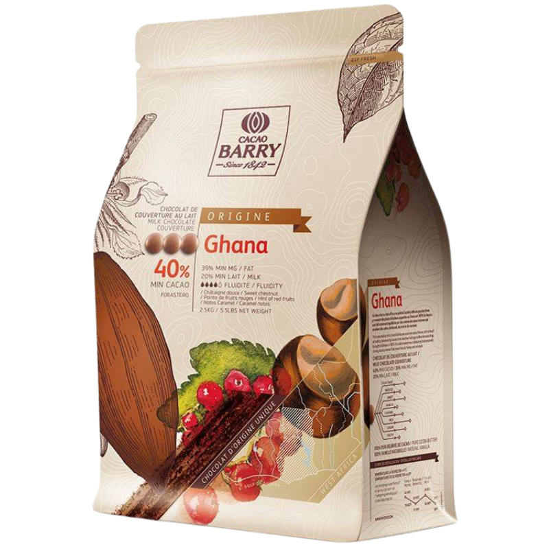 Niezwykła mleczna czekolada wytwarzana z wyselekcjonowanych ziaren kakaowych pochodzących z Ghany. Ma zdecydowany smak kakao z nutą kwasowości - dostarczaną przez ziarna, które zawdzięczają swoje dziedzictwo brazylijskim sadzonkom przywiezionym do Ghany (w 1879 roku). Subtelna słodycz z silnym aromatem kakao oraz słodkimi nutami herbatników, miodu i karmelu. Wysoka płynność czekolady sprawia, że doskonale sprawdzi się do oblewania, podczas produkcji pralin (krojonych i formowanych) oraz do tworzenia wyjątkowych tabliczek czekolady. Czekolada Origine Ghana - to mleczna czekolada o minimalnej zawartości kakao 40.5% i statusie kuwertury (zawartość masła kakaowego - 39%).