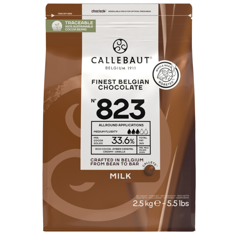Uniwersalna mleczna czekolada wytwarzana z mieszanki wyselekcjonowanych ziaren kakaowych z trzech różnych krajów - Wybrzeże Kości Słoniowej, Ghana, Ekwador - dla uzyskania idealnie harmonijnego, bogatego smaku. Czekolada zawdzięcza swój unikalny profil smakowy wysokiej zawartości kakao pozyskiwanego z najlepszych ziaren. Charakteryzuje się zrównoważonym i bogatym smakiem z dominującymi nutami mleka i karmelu. Idealna płynność czekolady sprawia, że doskonale sprawdzi się w różnorodnych zastosowaniach. Receptura numer 823 - to mleczna belgijska czekolada o minimalnej zawartości kakao 33.6% i statusie kuwertury (zawartość masła kakaowego - 36.2%).
