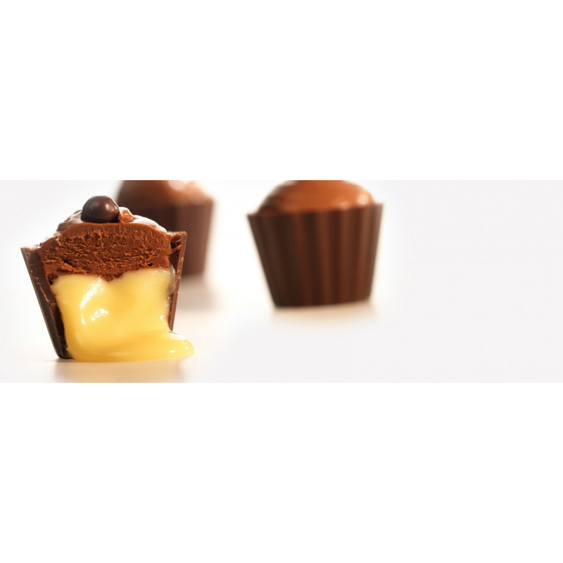 Ganache ma odpowiednią konsystencję do szprycowania form cukierniczych – takich jak praliny, batony czekoladowe i czekoladowe kubeczki.