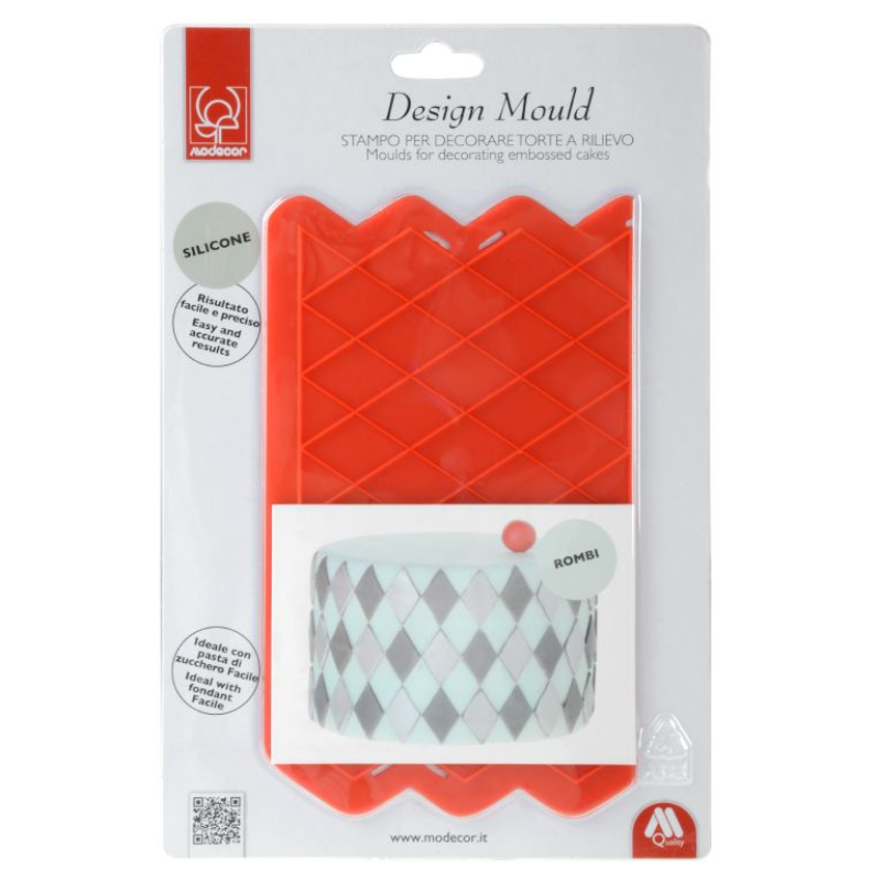 SILICONE DESIGN MOULD - to seria płaskich form silikonowych dostępnych w różnych wzorach przeznaczonych do tworzenia tłoczonych dekoracji z masy cukrowej. Stosowanie form pozwala na proste i szybkie wykonywanie precyzyjnych dekoracji. Tłoczone dekoracje idealnie sprawdzą się na tortach obłożonych masą cukrową, gładkim tynkiem lub kremem. Do tłoczenia dekoracji można stosować kolorowe masy cukrowe. Gotowe dekoracje można również dowolnie urozmaicać przy użyciu barwników, farb i pyłków spożywczych. Formy wykonane z silikonu są elastyczne, co zapewnia łatwe przenoszenie dekoracji na tort.