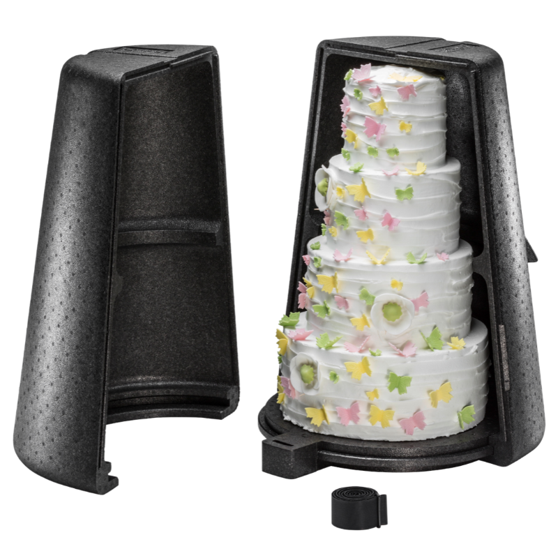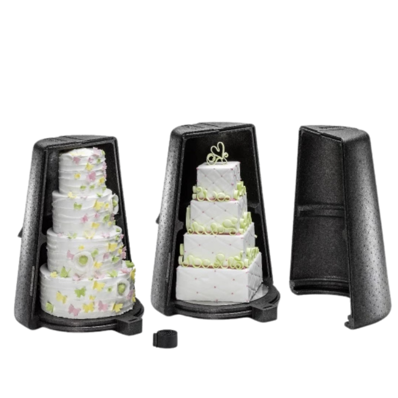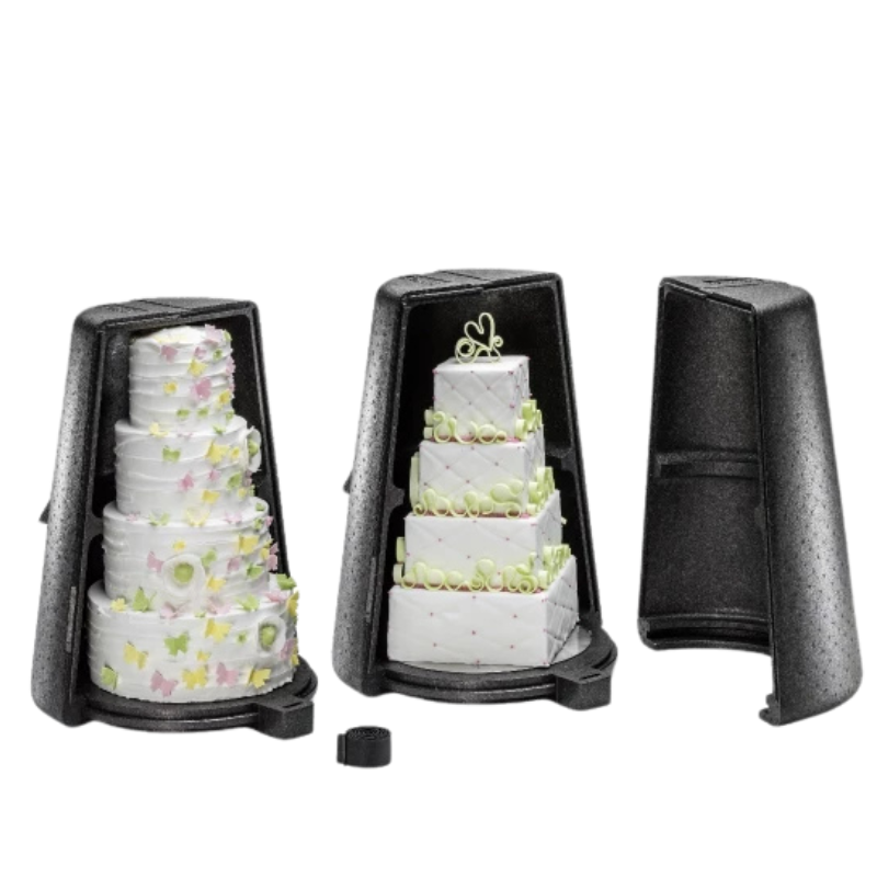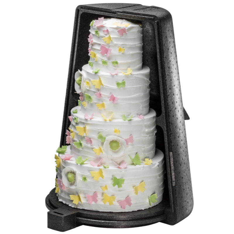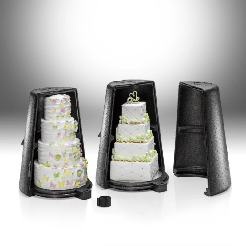 Termobox zaprojektowany do bezpiecznego transportu wielopoziomowych tortów. Pojemnik izotermiczny na tort piętrowy złożony z trzech elementów, które zabezpiecza się przy użyciu specjalnego pasa. Okrągła podstawa o wewnętrznej średnicy 52 centymetrów oraz dwie części boczne o wysokości wewnętrznej około 68 centymetrów.