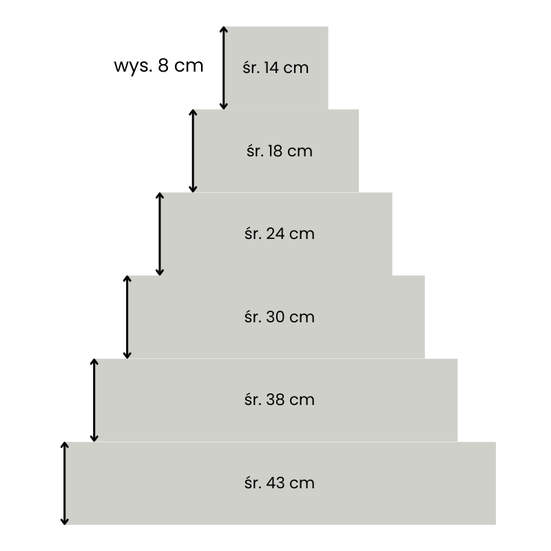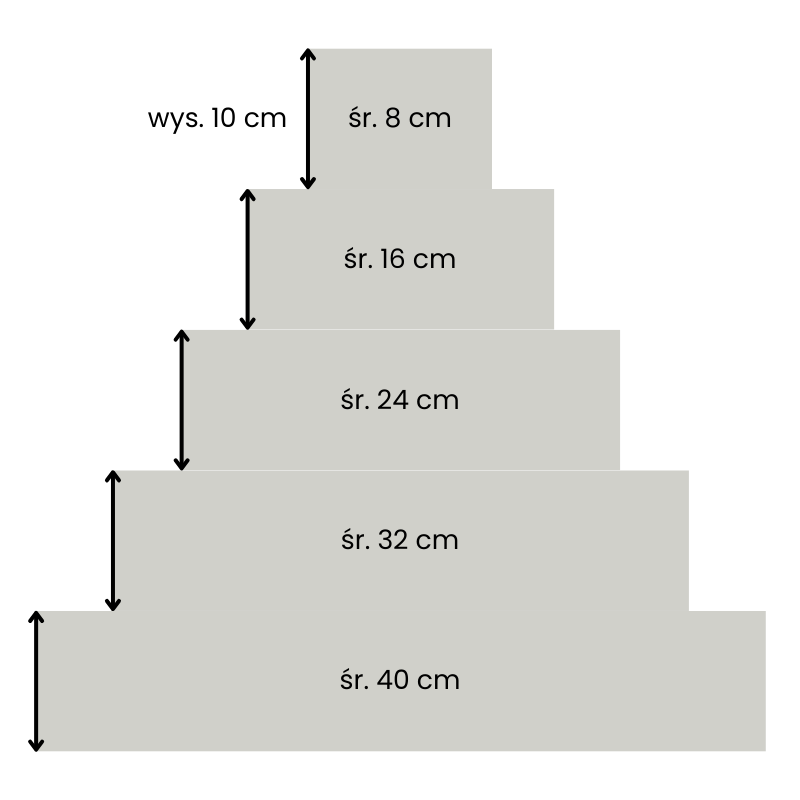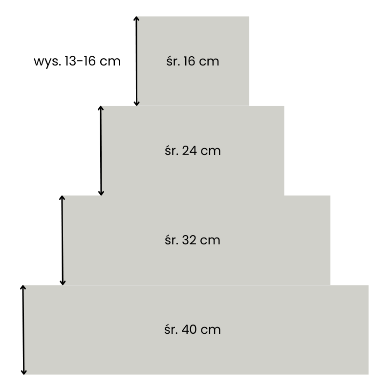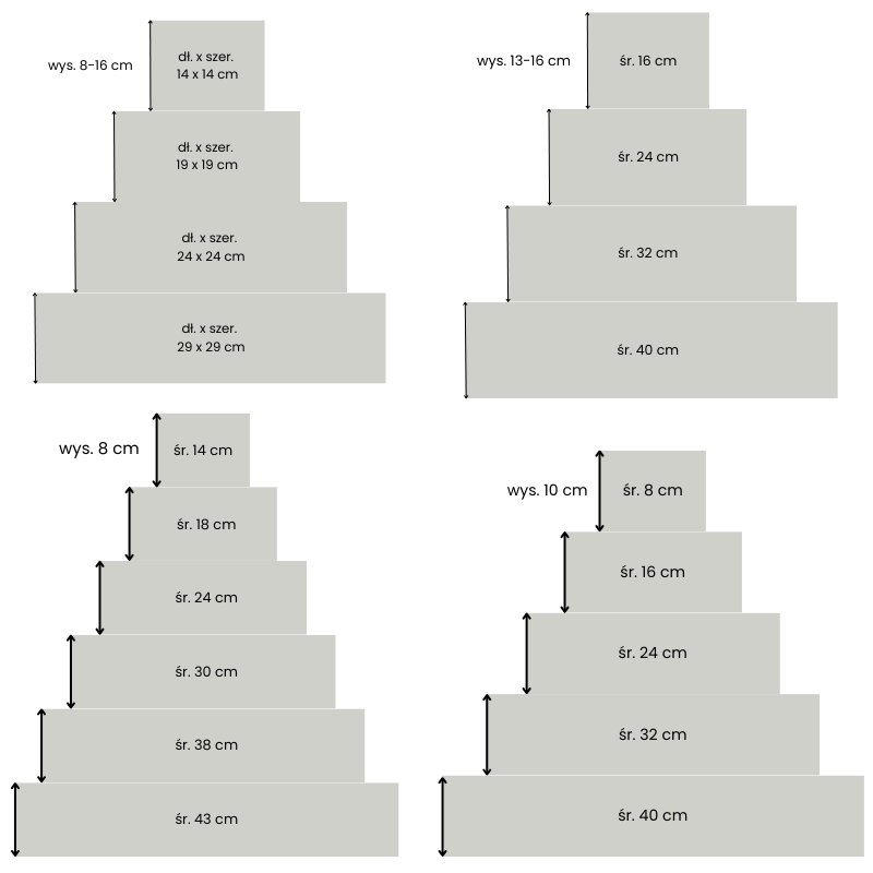 Przykładowe wymiary tortów piętrowych możliwych do przewiezienia w pojemniku termoizolacyjnym znajdują się na zdjęciach katalogowych produktu.