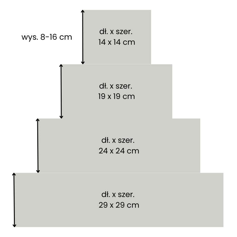 | Zastosowanie | do transportu wielopoziomowych tortów na okrągłych lub kwadratowych podstawkach do tortów weselnych |