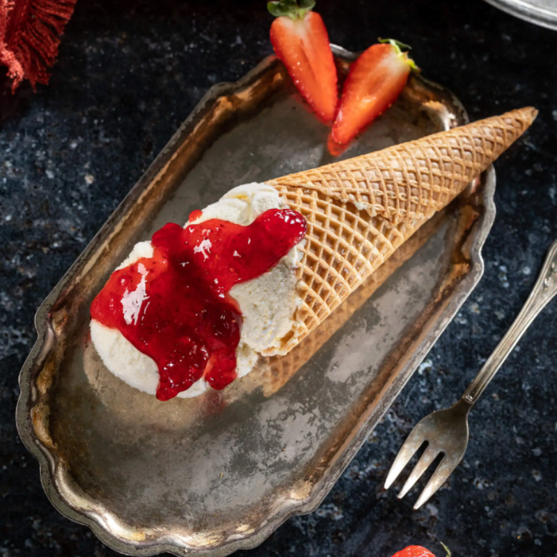 Intensywnie truskawkowa pasta do przekładania i dekorowania lodów. Ciemnoczerwona barwa charakterystyczna dla truskawek dojrzewających w słońcu. Wysoka zawartość owoców (40%). Idealna do lodów mascarpone i ricotta!