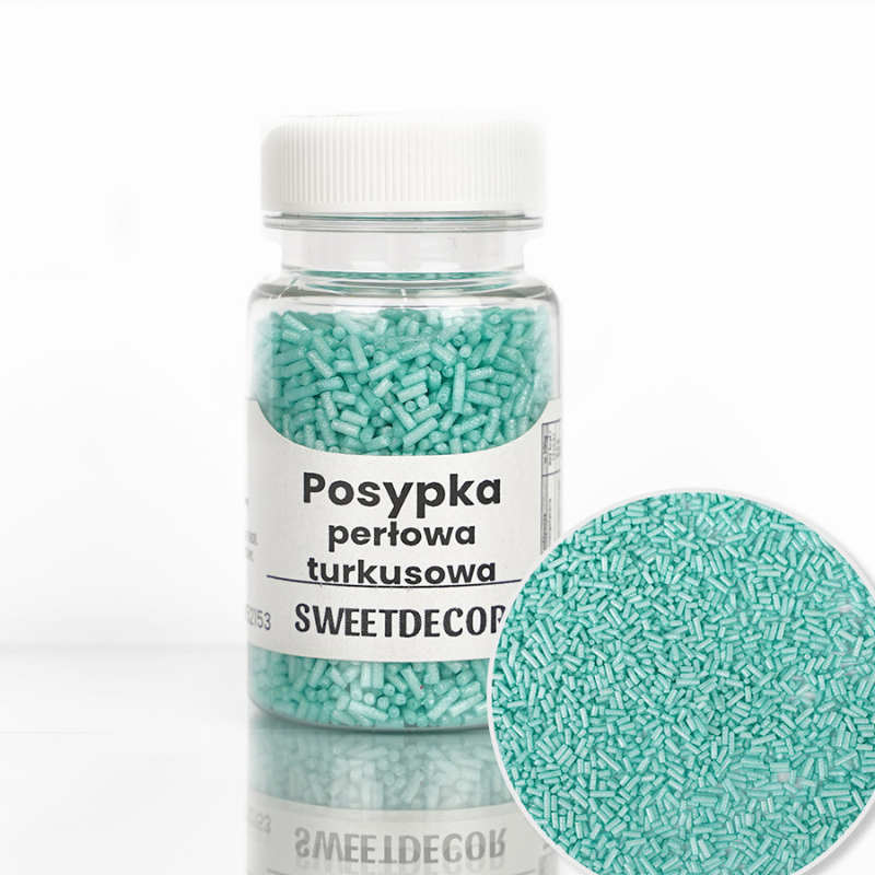Perłowa posypka cukrowa do dekoracji domowych słodyczy - tortów, babeczek, ciasteczek, lizaków i czego tylko zamarzysz! Posypka perłowa turkusowa od Sweet Decor - drobne pałeczki cukrowe do dekoracji - gotowa do użycia błyszcząca posypka do ozdabiania wypieków i deserów. Małe i wygodne opakowanie idealne do użytku domowego!