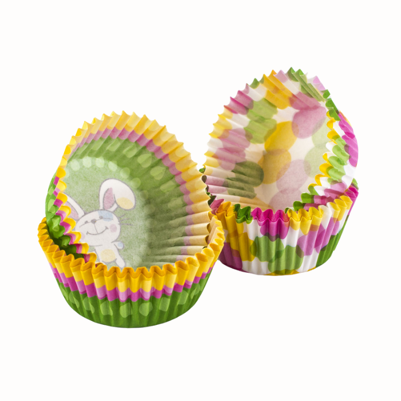 Dekoracyjne papierowe foremki do wypieku małych babeczek i muffinek. Zestaw kolorowych papilotek doskonale sprawdzi się do serwowania wielkanocnych słodyczy.
