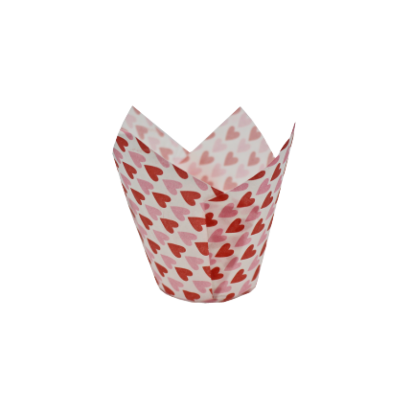 Tulipany to rodzaj papilotek przeznaczonych do wypieku klasycznych muffinów oraz większych babeczek. Wykonane są jednego kawałka papieru o gramaturze 60 gsm zwiniętego w kształt tulipana. Papier wykazuje odporność na działanie wysokiej temperatury, tłuszczu oraz wilgoci. Papilotki przeznaczone są do pieczenia, prezentacji i przechowywania. Wzór w czerwone oraz różowe serduszka doskonale sprawdzi się do przygotowywania walentynkowych wypieków.