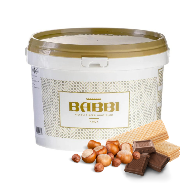 Kremowa pasta gianduia (połączenie kakao z prażonymi orzechami laskowymi) z dodatkiem chrupiących wafelków - do przekładania i dekorowania lodów w kuwetach oraz stosowania w wyrobach cukierniczych.