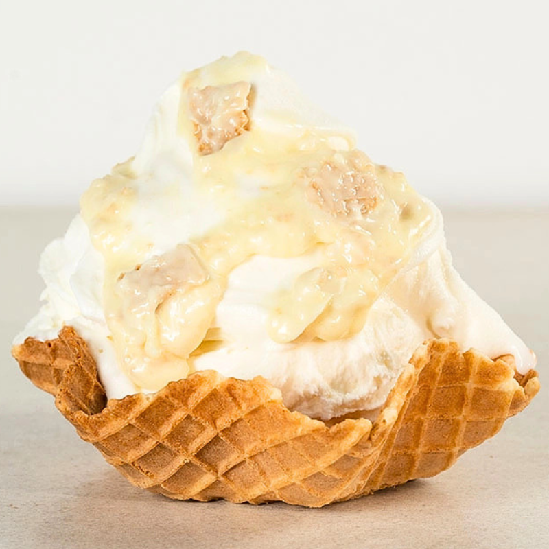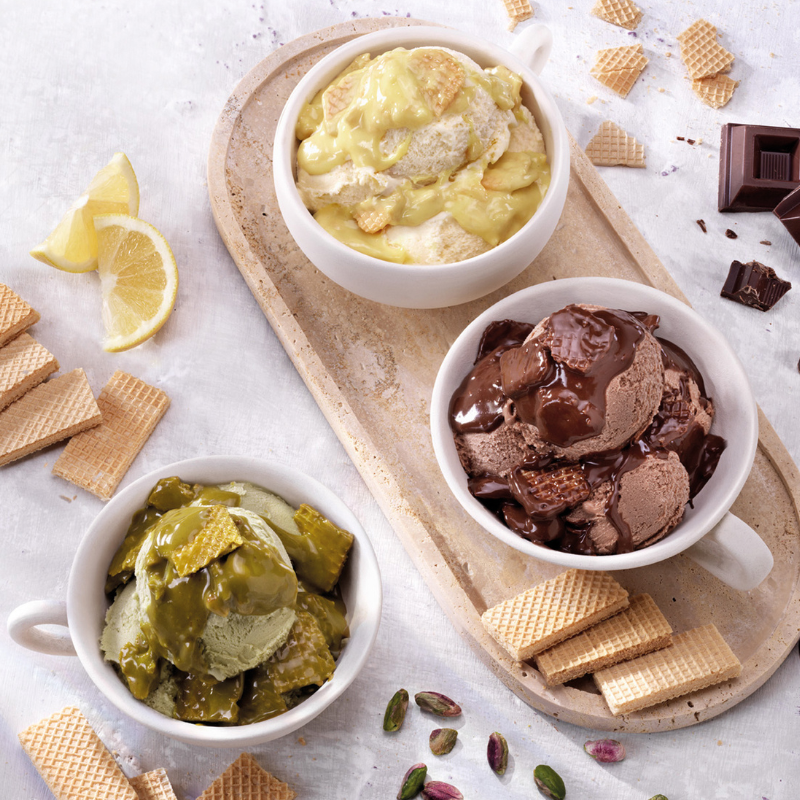 VARIEGATI WAFERINI - seria past variegato z chrupiącymi wafelkami do przekładania i dekorowania. Wyjątkowe połączenie gładkiej i kremowej konsystencji pasty smakowej z chrupiącym wafelkiem i dodatkami. Zastosowanie pasty pozwala na osiągnięcie zaskakującego kontrastu tekstur w szybki i prosty sposób. Dopracowane smaki kremów z chrupiącymi dodatkami to doskonały dodatek do lodów i wyrobów cukierniczych. Pasty variegato to gotowe do użycia kremy z dodatkami, które stosuje się na zasadzie quantum satis. Wytwarzane z wyselekcjonowanych składników i utrwalane w opakowaniu, co zapewnia ich wysoką jakość i trwałość.