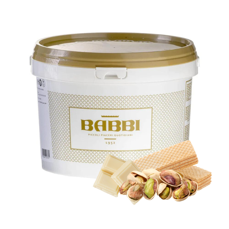 Składniki: oleje roślinne (olej słonecznikowy, masło illipe, masło shea, olej bawełniany, olej palmowy), pistacje prażone, cukier, biała czekolada (6.7%) (cukier, masło kakaowe, mleko w proszku, serwatka z mleka w proszku, emulgator: lecytyna sojowa (E322), ekstrakt waniliowy), praliny pistacjowe (5%) (cukier (60%), pistacje (40%)), wafelek (4%) (mąka pszenna, skrobia ziemniaczana, olej kokosowy, odtłuszczone mleko w proszku, cukier, pełnoziarnista mąka sojowa, emulgator: lecytyna sojowa (E322), żółtko jaja w proszku, substancje spulchniające: węglany (E500ii), difosforany (E450), sól), kawałki herbatników (2%) (mąka pszenna, cukier, tłuszcz słonecznikowy i palmowy, skrobia pszenna, mleko pełne, jaja, substancje spulchniające: difosforany (E450), węglany sodu (E500), węglany amonu (E503), aromaty, sól), dekstroza, barwnik: kurkuma (E100), karoteny (E160a), błękit brylantowy FCF (E133); może zawierać pozostałe orzechy, w tym orzechy arachidowe, sezam oraz ich pochodne.