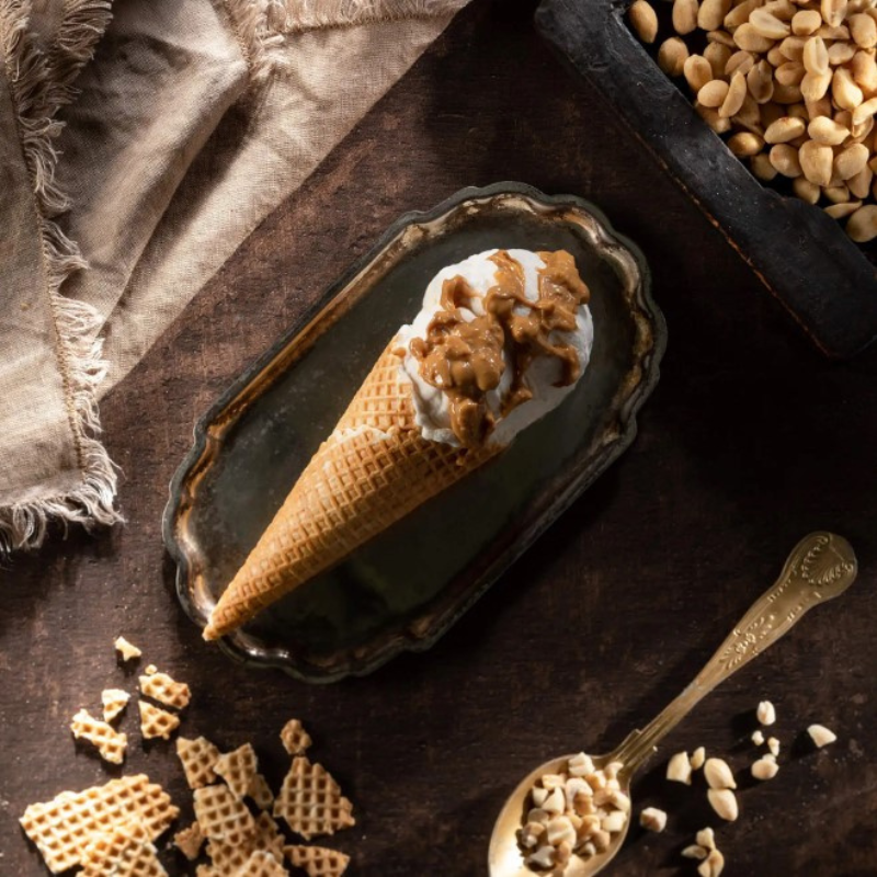 Kremowa pasta o smaku masła orzechowego z lekką słoną nutą, z dodatkiem chrupiących wafelków i siekanych orzeszków ziemnych - do przekładania i dekorowania lodów w kuwetach oraz stosowania w wyrobach cukierniczych.