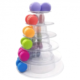 Modułowy stojak do serwowania i prezentacji francuskich makaroników - możliwość stosowania dowolnej ilości pięter. Transparentna patera z tworzywa pozwala na efektowną ekspozycję kolorowych ciasteczek.