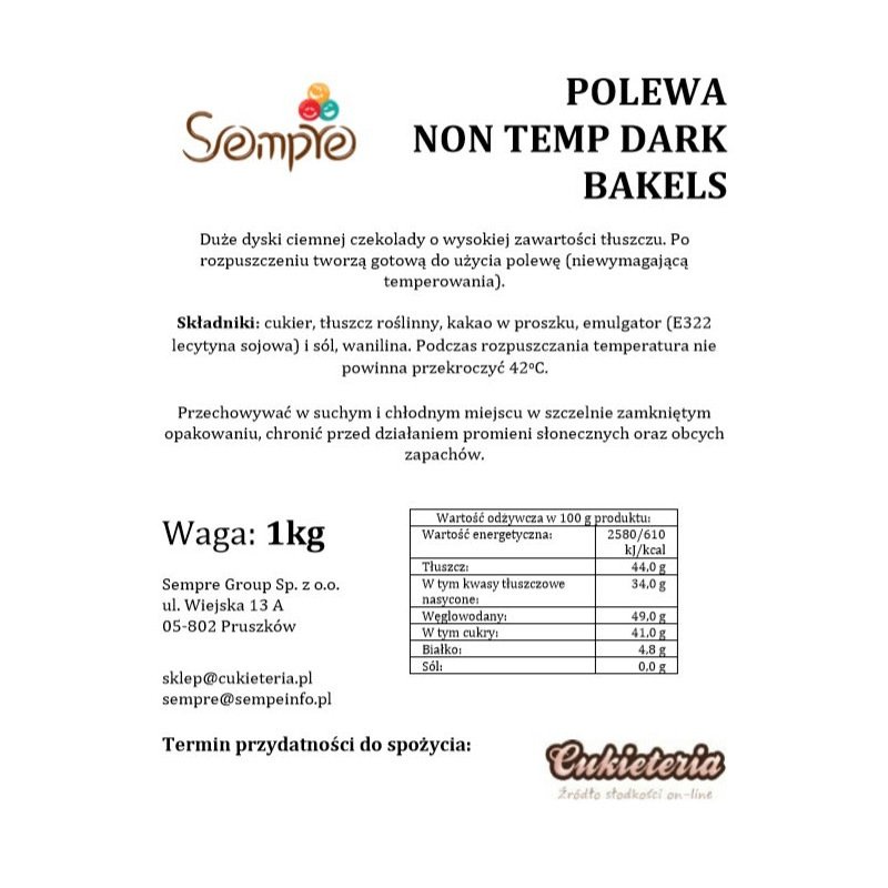1kg NON TEMP DARK Surogat czekoladowy/polewa czekoladowa CIEMNA Bakels