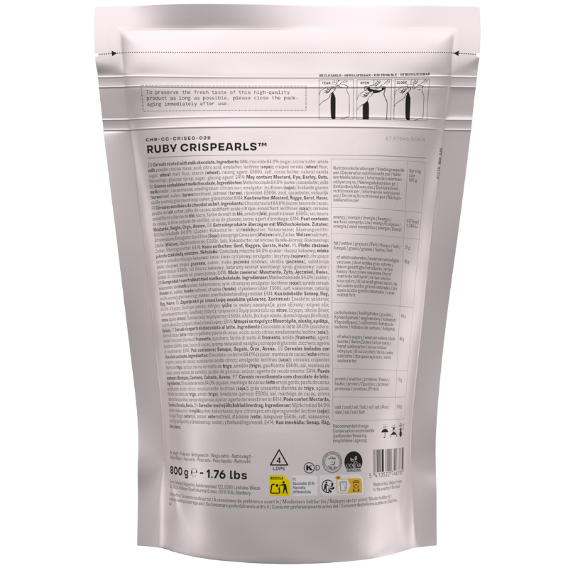 Składniki: czekolada Ruby (84%) (cukier, tłuszcz kakaowy, mleko pełne w proszku, miazga kakaowa, regulator kwasowości: kwas cytrynowy (E330), emulgator: lecytyna sojowa (E322)), chrupiące kuleczki zbożowe (mąka pszenna, cukier, mąka pszenna słodowa, skrobia pszenna, substancja spulchniająca: wodorowęglan sodu (E500ii), sól, tłuszcz kakaowy, naturalny aromat waniliowy), syrop glukozowy, cukier, substancja glazurująca: guma arabska (E414).
