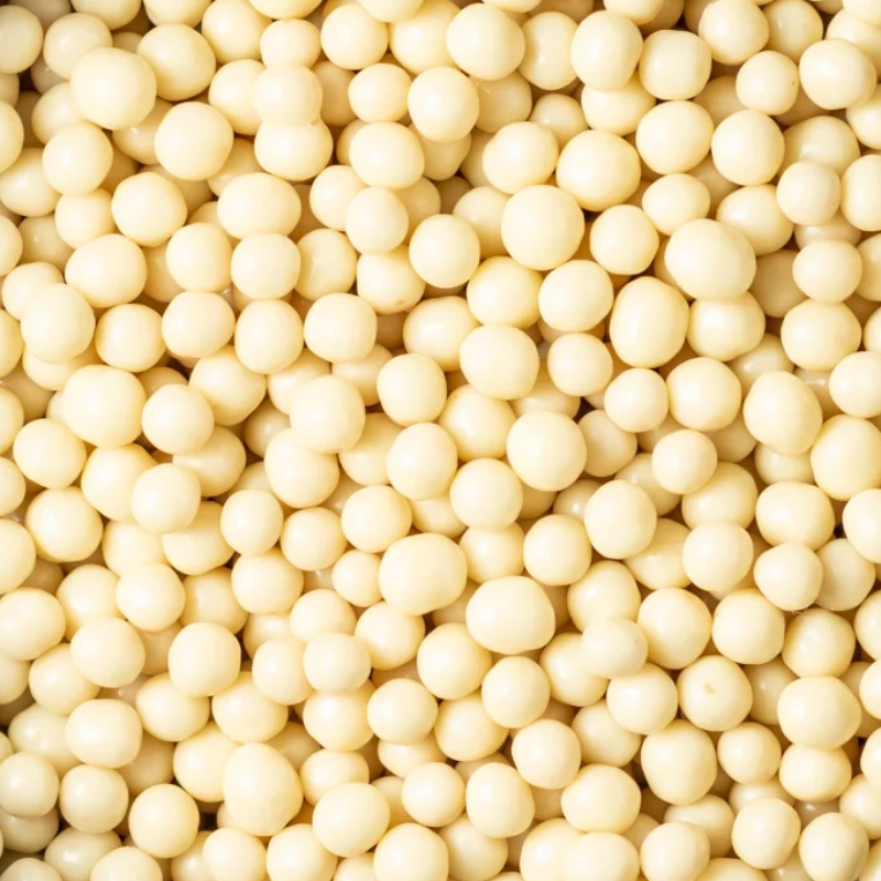Chrupiące kuleczki ryżowe w polewie z białej czekolady. Chrupiąca posypka dekoracyjna do urozmaicania i ozdabiania wypieków i deserów. Chrupiące kuleczki czekoladowe do dekoracji lodów, tabliczek czekolady, pralin, trufli, lizaków z ciasta, nowoczesnych monoporcji i wielu innych zastosowań.