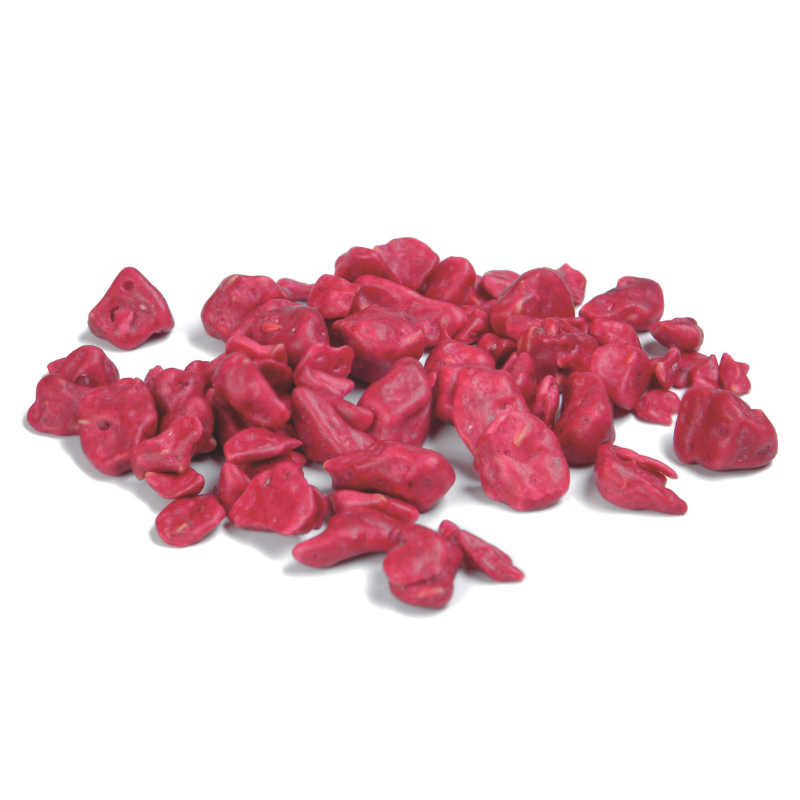 Malinowe Crispy Wet Proof, to chrupiące kawałki liofilizowanych malin pokryte cienką warstwą tłuszczu kakaowego - dodatek dekoracyjny, smakowy i teksturalny. Posypka owocowa w formie nieregularnych kawałków o wielkości od 2 do 15 milimetrów.