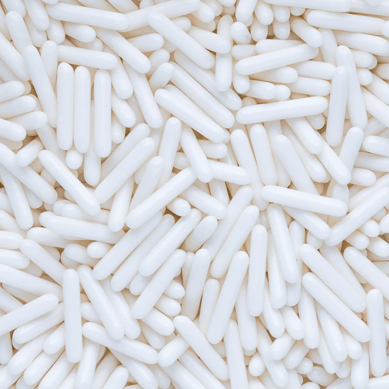 White Macaroon Sprinkle It, to dekoracyjna posypka cukrowa w postaci dużych pałeczek w kolorze naturalnej bieli. Błyszczące makaroni cukrowe o długości około 20 mm. Doskonale sprawdzą się do udekorowania tortu komunijnego i tortu weselnego.