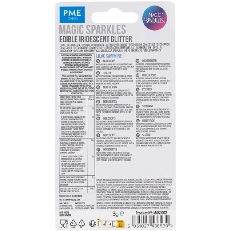 Poczuj słodki luksus dodając elegancji i połysku słodkim kreacjom. Seria opalizujących brokatów do dekoracji spożywczych oferuje niezrównaną elegancję, przekształcając wypieki w prawdziwe klejnoty. Magic Sparkles, to dekoracyjny brokat spożywczy w postaci nieregularnych drobinek z opalizującym efektem. Błyszczące posypki doskonale pasują do klasycznych wyrobów cukierniczych nadając im szyku i wyjątkowej elegancji. Posypki pozwalają uzyskać charakterystyczny mieniący się efekt. Wykorzystywane są przede wszystkim do ozdabiania czekoladek, ciasteczek, babeczek, tortów, deserów i wypieków. Najlepszy i najtrwalszy efekt uzyskuje się stosując posypki do dekorowania wyrobów o niskiej zawartości wody. Posypki umieszczone są w eleganckich słoiczkach ze srebrną nakrętką, dzięki czemu pięknie prezentują się jeszcze przed umieszczeniem ich na dekorowanych wyrobach.