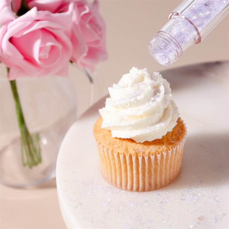 Jadalne drobinki opalizującego brokatu do kreatywnych dekoracji wyrobów cukierniczych. Dekoracyjna posypka cukiernicza do ozdabiania wypieków i deserów.