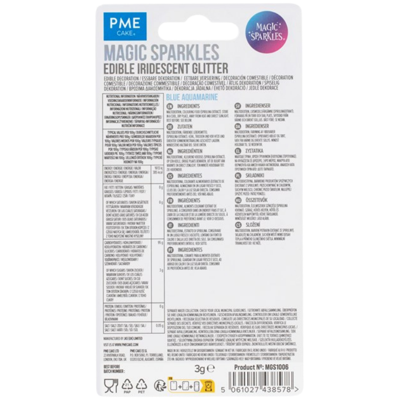 Poczuj słodki luksus dodając elegancji i połysku słodkim kreacjom. Seria opalizujących brokatów do dekoracji spożywczych oferuje niezrównaną elegancję, przekształcając wypieki w prawdziwe klejnoty. Magic Sparkles, to dekoracyjny brokat spożywczy w postaci nieregularnych drobinek z opalizującym efektem. Błyszczące posypki doskonale pasują do klasycznych wyrobów cukierniczych nadając im szyku i wyjątkowej elegancji. Posypki pozwalają uzyskać charakterystyczny mieniący się efekt. Wykorzystywane są przede wszystkim do ozdabiania czekoladek, ciasteczek, babeczek, tortów, deserów i wypieków. Najlepszy i najtrwalszy efekt uzyskuje się stosując posypki do dekorowania wyrobów o niskiej zawartości wody. Posypki umieszczone są w eleganckich słoiczkach ze srebrną nakrętką, dzięki czemu pięknie prezentują się jeszcze przed umieszczeniem ich na dekorowanych wyrobach.