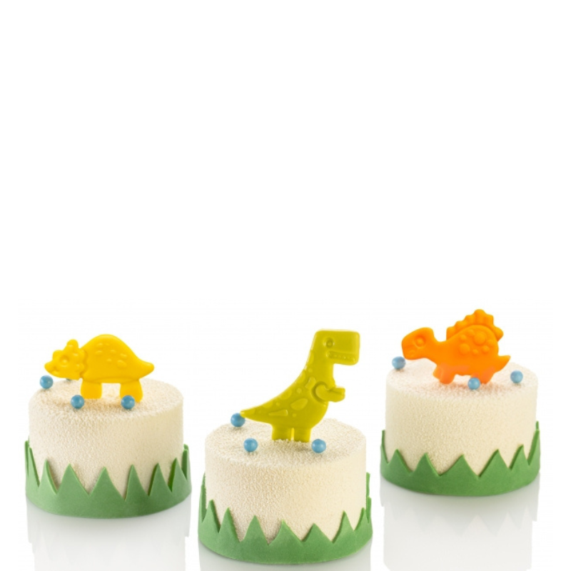 Kolorowa dekoracja w kształcie dinozaurów wykonana z wysokiej jakości barwionej białej czekolady. Idealny sposób na szybką i efektowną dekorację Twoich słodkich wyrobów. Doskonale sprawdzą się zarówno w profesjonalnej jak i domowej pracowni cukierniczej.