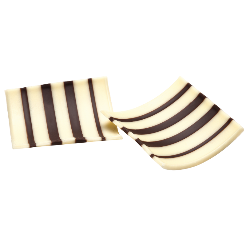 Opis: profilowana, kwadratowa dekoracja w paski wykonana z białej i ciemnej czekolady.