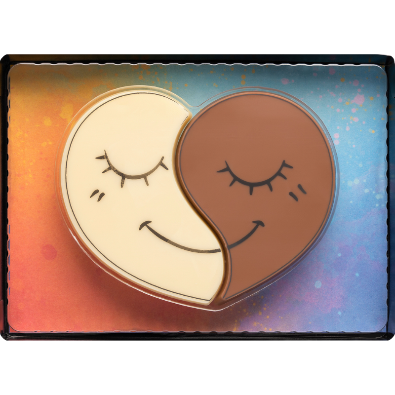 Produkt wykonany z dekorowanej mlecznej czekolady o minimalnej zawartości składników kakao 36% oraz dekorowanej białej czekolady o minimalnej zawartości składników kakao 13%.