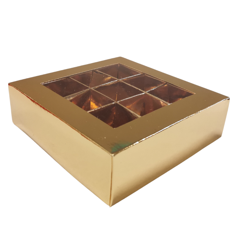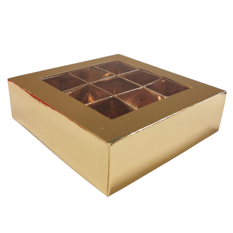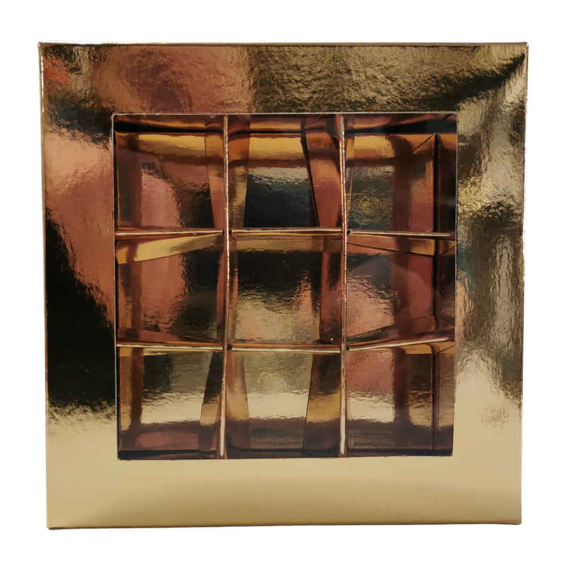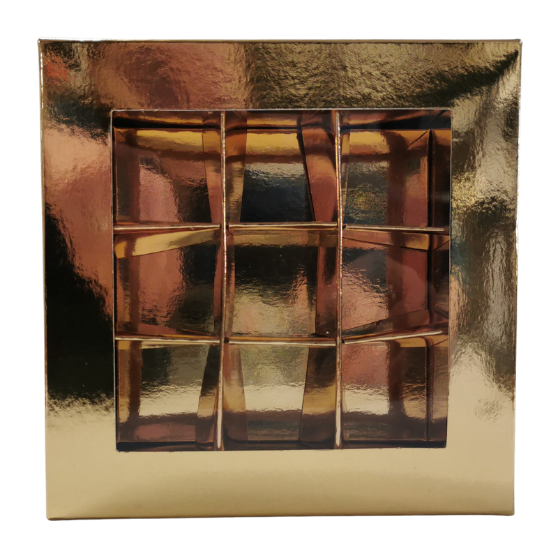Eleganckie i praktyczne pudełko do pakowania pralin. Złote opakowanie z okienkiem na 9 sztuk czekoladek. Pudełko o wymiarach dł. 140 x szer. 140 x wys. 40 mm, z przegródkami o wymiarach dł. 35 x szer. 35 x wys. 25 mm. Idealnie sprawdzi się do pakowania własnoręcznie wykonanych słodkich prezentów na każdą okazję.