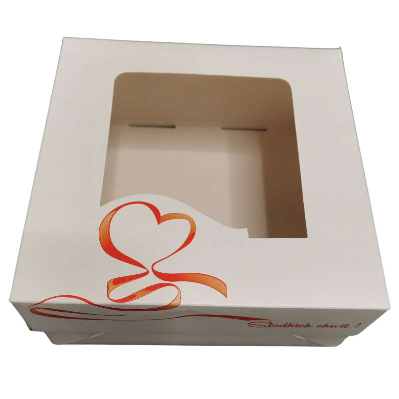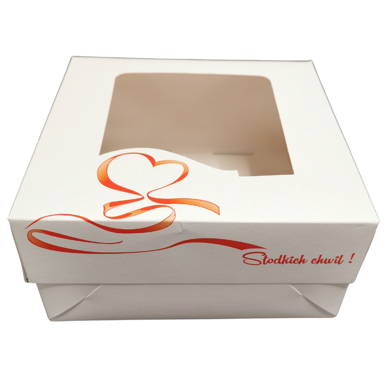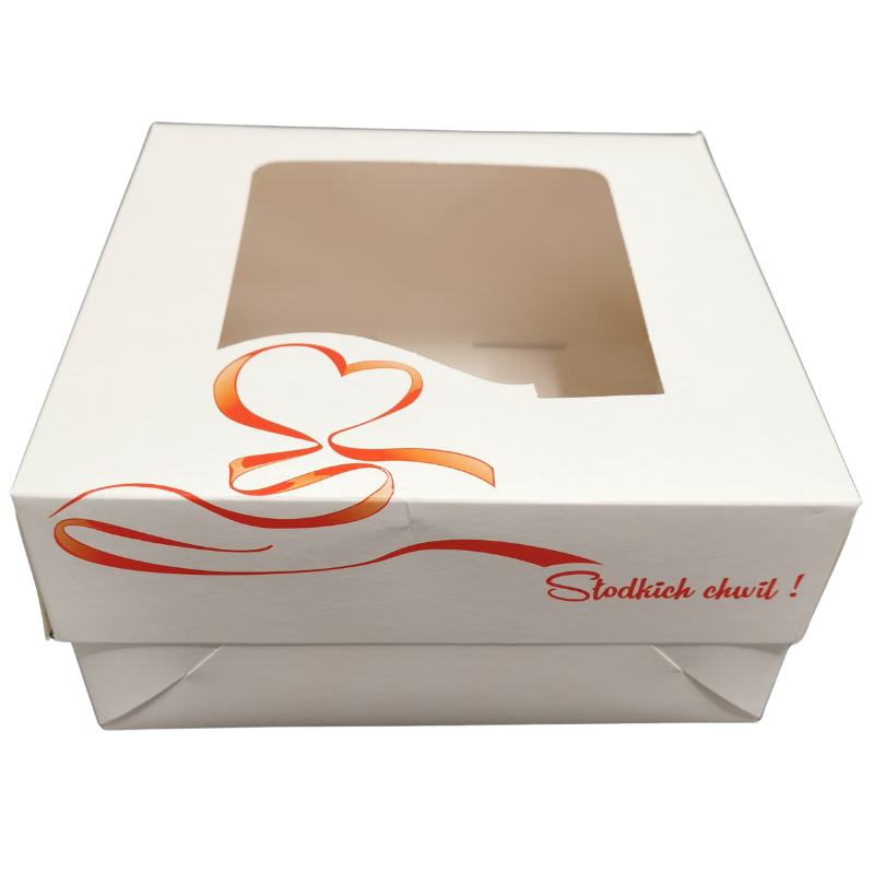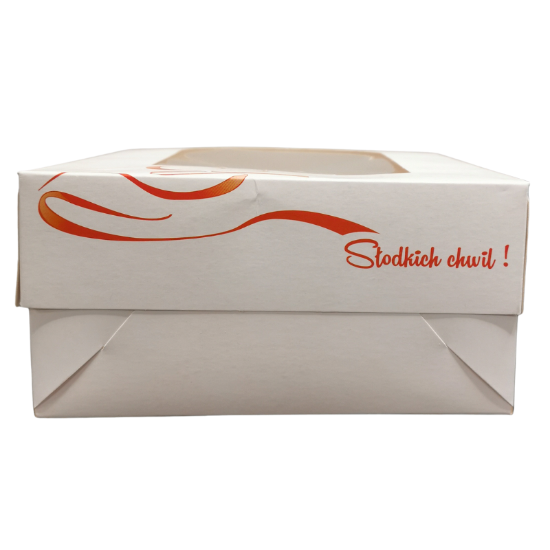 Eleganckie i praktyczne opakowanie na ciasto z napisem "Słodkich chwil". Kwadratowe pudełko z transparentnym okienkiem i dekoracyjnym nadrukiem. Pozwala na efektowną prezentację domowych wypieków i ręcznie dekorowanych wyrobów. Pudełko prezentowe wykonane jest ze sztywnej tektury o gładkiej powierzchni. Łatwe do złożenia i gotowe do użycia. Wykonane z materiałów przeznaczonych do kontaktu z żywnością. Opakowanie z napisem zapewnia nie tylko elegancką prezentację ale także zabezpiecza delikatne wyroby podczas transportu i przechowywania. Pudełko doskonale sprawdzi się podczas sezonowej sprzedaży ręcznie dekorowanych i personalizowanych wypieków i słodyczy.