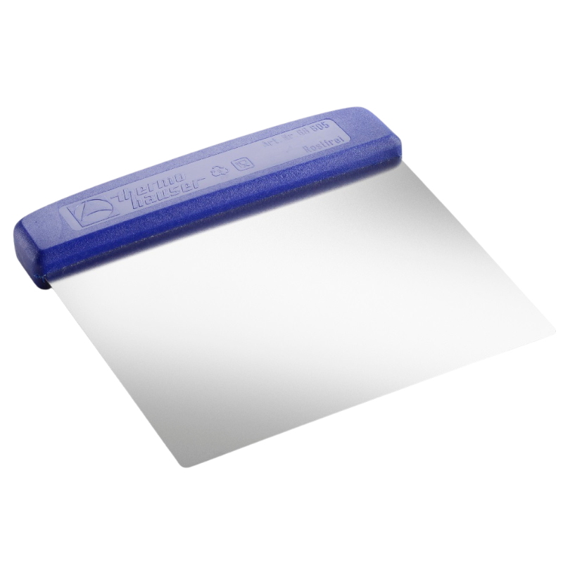 Stalowa skrobka cukiernicza z niebieskim uchwytem z tworzywa - dł. 12 x szer. 12 cm - nr. kat. 68605 Thermohauser