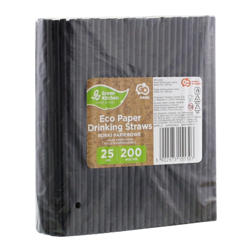 Uniwersalne papierowe słomki do ciepłych i zimnych napojów w kolorze czarnym. Całkowicie bezpieczne dla środowiska - biodegradowalne. Nie wpływają na smak serwowanych napojów. Idealne do lemoniady i kaw mrożonych.