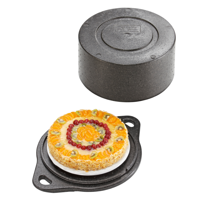 Termobox zaprojektowany do bezpiecznego transportu tortów i ciast. Pojemnik izotermiczny na tort złożony z dwóch elementów. Okrągła podstawa o wewnętrznej średnicy 34 centymetrów oraz pokrywa o wysokości wewnętrznej około 15 centymetrów. Termobox doskonale nadaje się do transportu tortów na okrągłych lub kwadratowych podkładach. Pokrywa zapewnia solidne zamknięcie, a taca posiadająca wbudowane uchwyty, pozwala na wygodne i bezpieczne przenoszenie pojemnika. Termobox zapewnia dostarczenie tortu w stanie nienaruszonym.