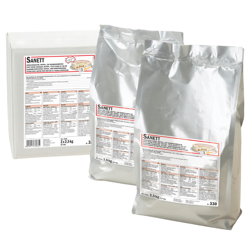 SANETT - to produkt na bazie cukru i żelatyny o neutralnym smaku, przeznaczony do stabilizowania słodzonej bitej śmietany (a także kremów cukierniczych oraz tortów i deserów musowych). Przed dodaniem produktu do stabilizowanej masy należy go dokładnie wymieszać z gorącą wodą (o temperaturze około 80°C) we właściwych proporcjach (40 g stabilizatora + 80 g gorącej wody + 1000 g słodzonej bitej śmietany). Stabilizator przeznaczony jest zarówno do użytku bezpośredniego jak i odroczonego użycia. W celu przygotowania mieszanki do późniejszego zastosowania należy połączyć 500 g stabilizatora z 1000 g gorącej wody (o temperaturze około 80°C). Mieszankę należy przechowywać w chłodnym miejscu. Podczas stosowania stabilizatora z wcześniej przygotowanej mieszanki należy przed użyciem podgrzać mieszankę do temperatury około 40°C (w kąpieli wodnej lub kuchence mikrofalowej). Stabilizator może być stosowany łącznie z dodatkiem past smakowych. Podczas stosowania past smakowych mieszankę stabilizatora z wodą należy najpierw połączyć z pastą smakową i dokładnie wymieszać. Następnie do mieszanki z pastą smakową dodać niewielką ilość bitej śmietany (lub kremu) i delikatnie wymieszać. Na koniec należy dodać pozostałą ilość bitej śmietany ( lub kremu) i dokładnie wymieszać. Mieszanka doskonale sprawdzi się również do nadawania odpowiedniej struktury i stabilizowania kremów cukierniczych, a także tortów i deserów musowych.