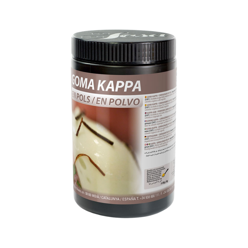 GOMA KAPPA EN POLVO OD SOSA INGREDIENTS - to hydrokoloid o właściwościach żelujących pozyskiwany z czerwonych alg morskich. Wykazuje również właściwości wychwytujące i utrzymujące wilgoć w produktach. Dodatek substancji do produktów pozwala na uzyskanie jędrnego i zarazem kruchego żelu. Guma kappa bardzo szybko żeluje w temperaturze 60°C (podobnie jak żelatyna) i wykazuje zróżnicowane reakcje na działanie wapnia oraz kwasów zawartych w produktach spożywczych. Jest to naturalny dodatek spożywczy przeznaczony do stosowania w produktach w ilości 1-10 g/kg (przy większych proporcjach - powyżej 10 g/kg może dawać twardy i bardzo kruchy (nieprzyjemny) żel). Podczas pracy z hyrdokoloidem pozyskiwanym z alg - należy rozpuścić go w temperaturze pokojowej oraz doprowadzić do wrzenia - w celu późniejszego żelowania. Wykazuje on wiele synergii z innymi substancjami żelującymi (na przykład - połączenie gumy konjac z gumą kappa - pozwala na uzyskanie termoplastycznego żelu).