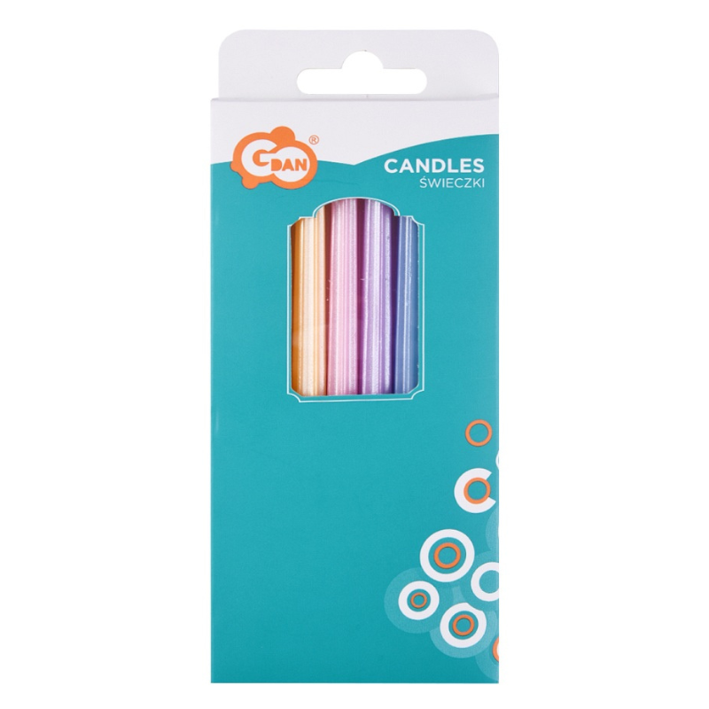 Urocze kolorowe świeczki na tort urodzinowy w pastelowych barwach. Idealny sposób na prostą dekorację domowego tortu. Zestaw 12 kolorowych świeczek i 12 podstawek do kompletu.