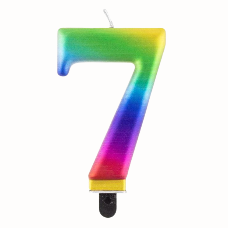 Tęczowe świeczki urodzinowe cyfry z metalicznym połyskiem. Kolorowe i błyszczące świeczki na tort urodzinowy. Tęczowe świeczki cyferki do tortu. Idealne uzupełnienie dekoracji tęczowego tortu i tortu w kształcie jednorożca.